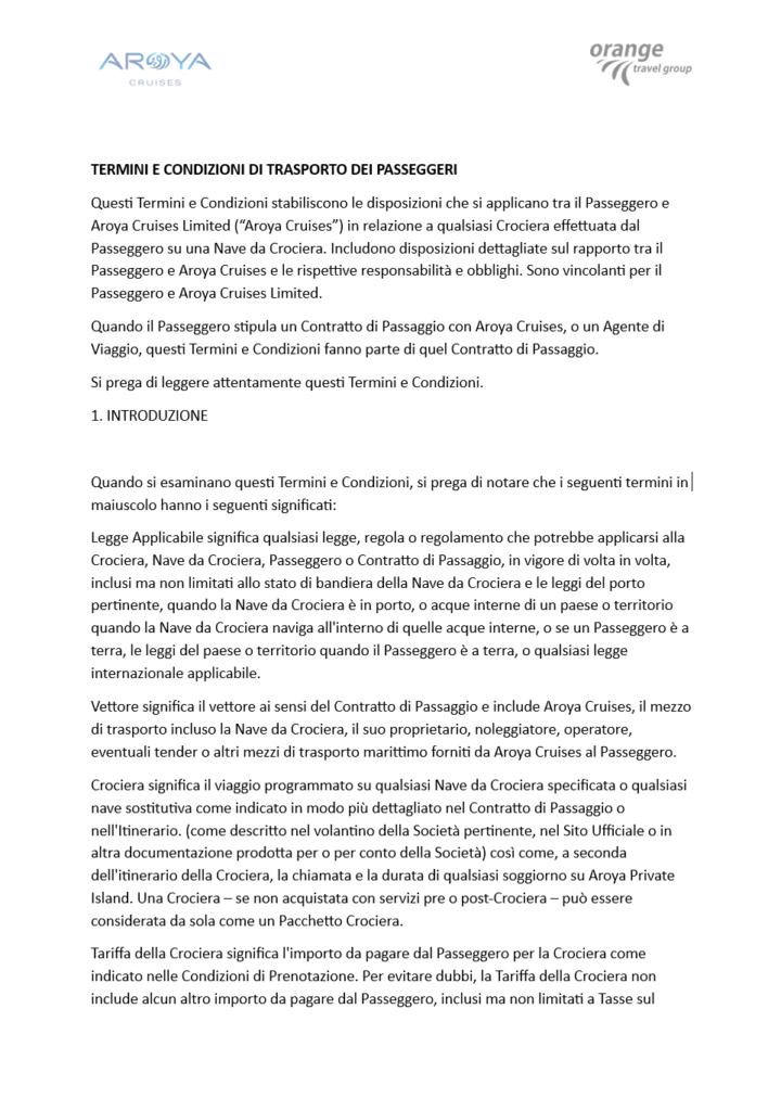 Questi Termini e Condizioni stabiliscono le disposizioni che si applicano tra il Passeggero e Aroya Cruises Limited (“Aroya Cruises”) in relazione a qualsiasi Crociera effettuata dal Passeggero su una Nave da Crociera.